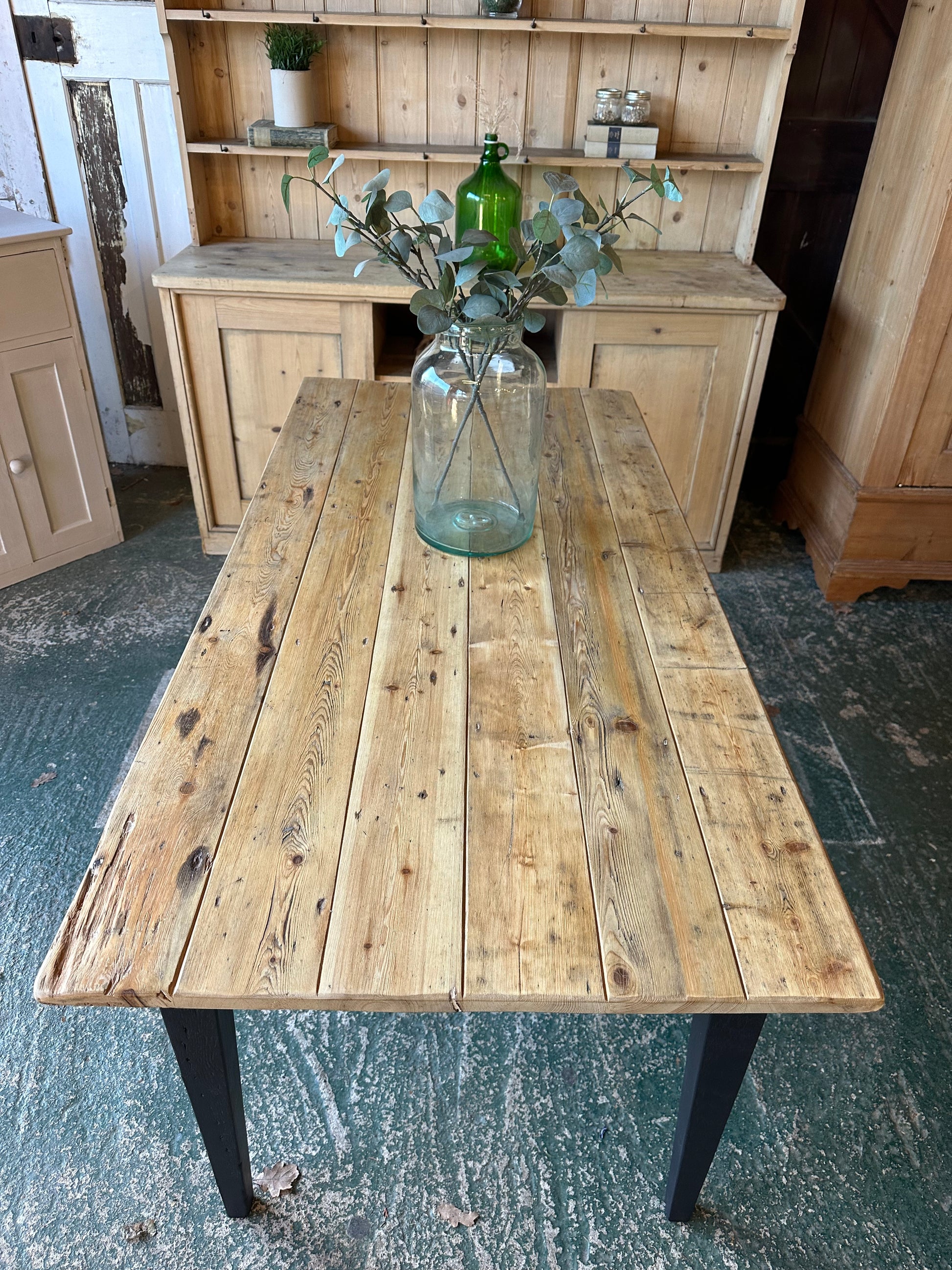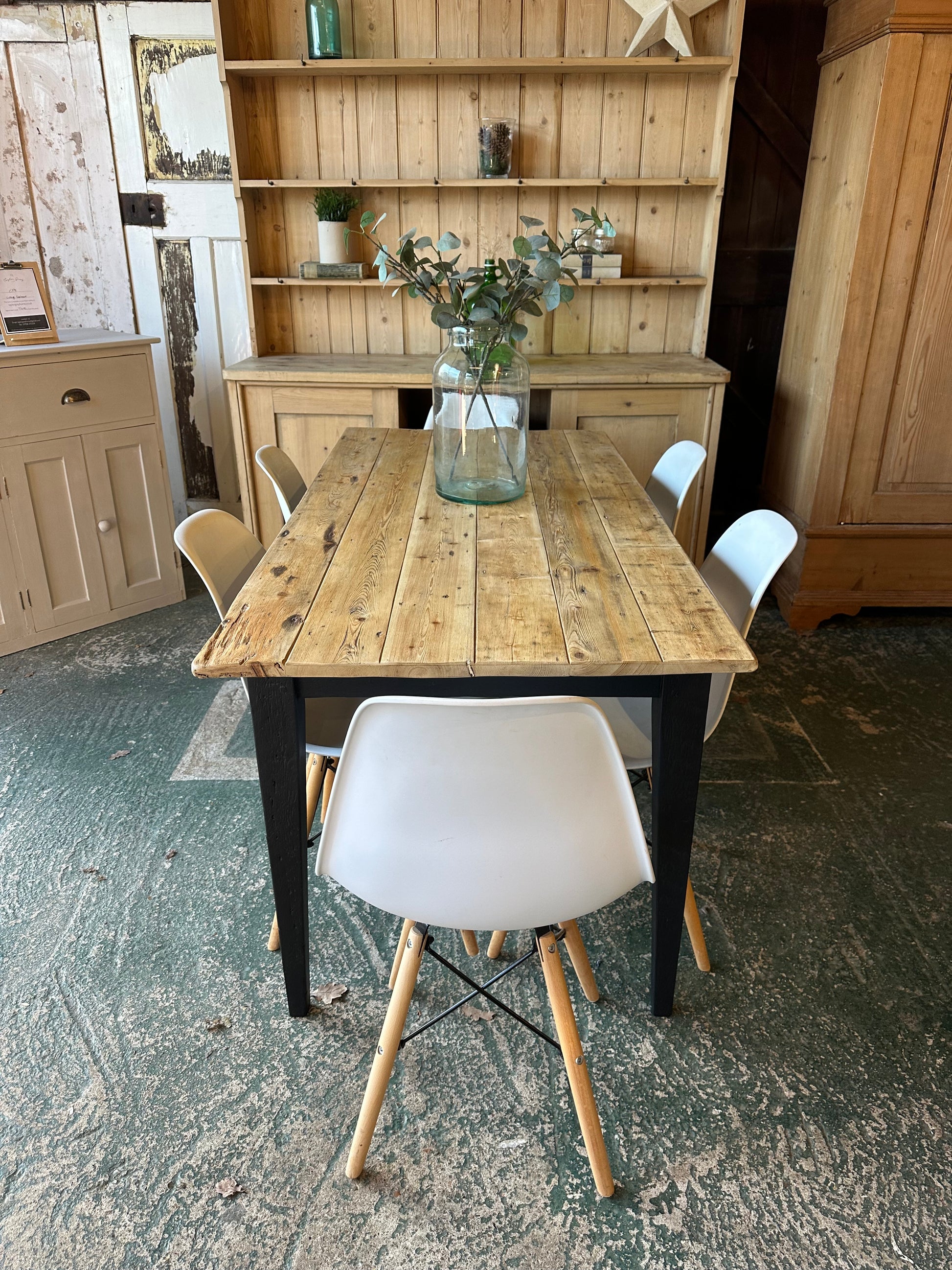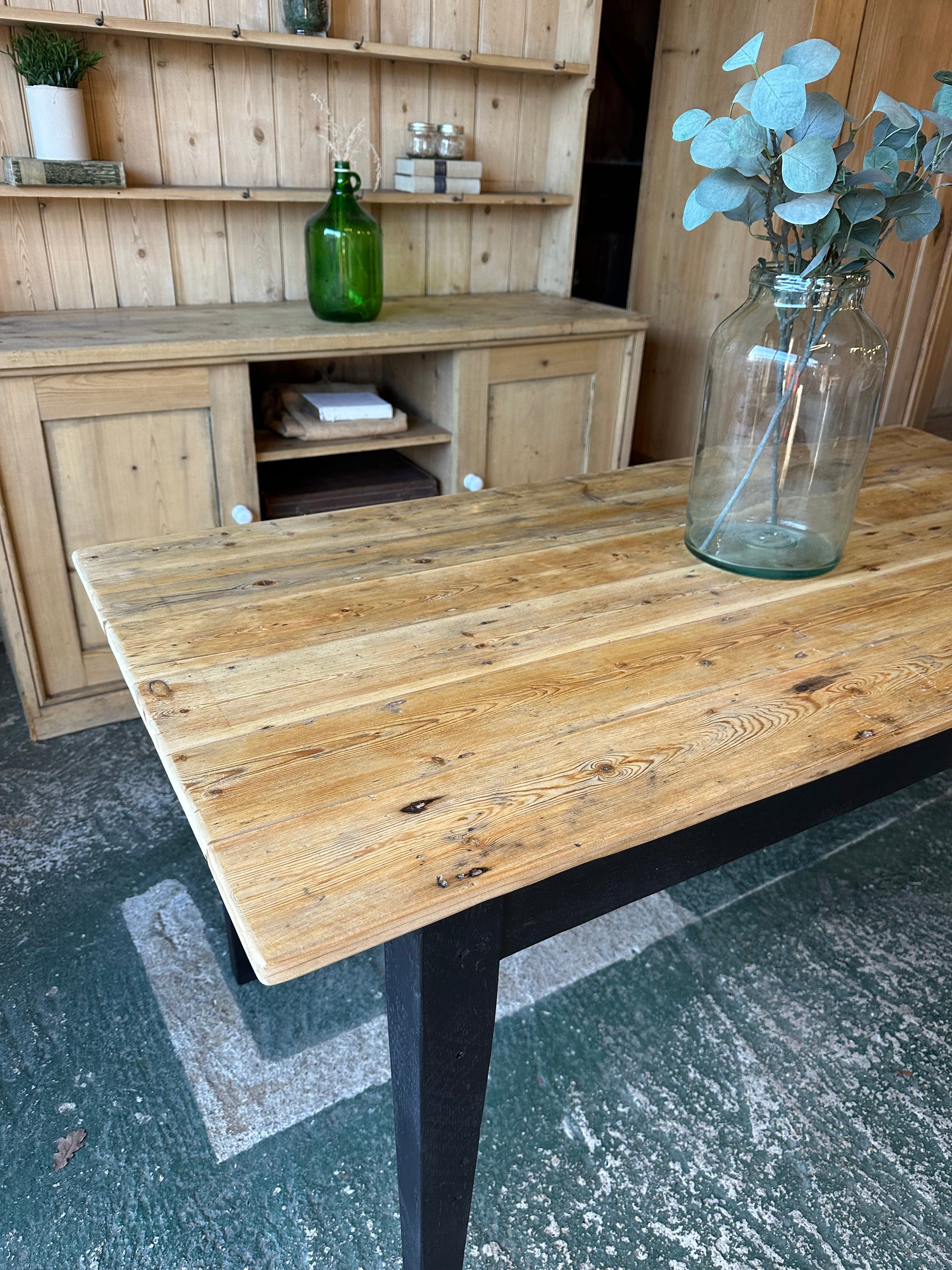 Beautiful rustic farmhouse table with gorgeous distressed top, legs painted in black.