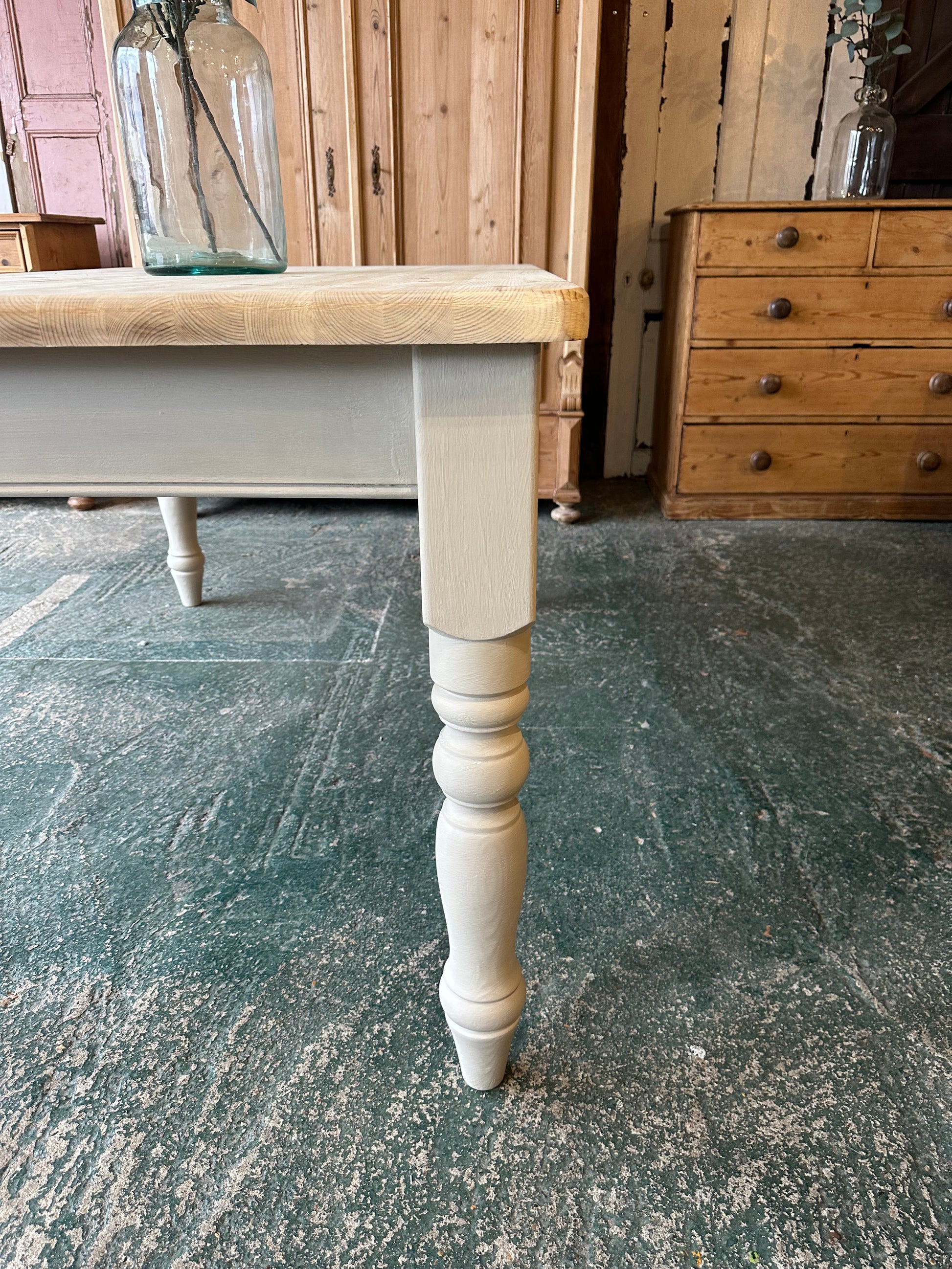 Beautiful rustic farmhouse table with gorgeous distressed top and legs painted a grey/beige.