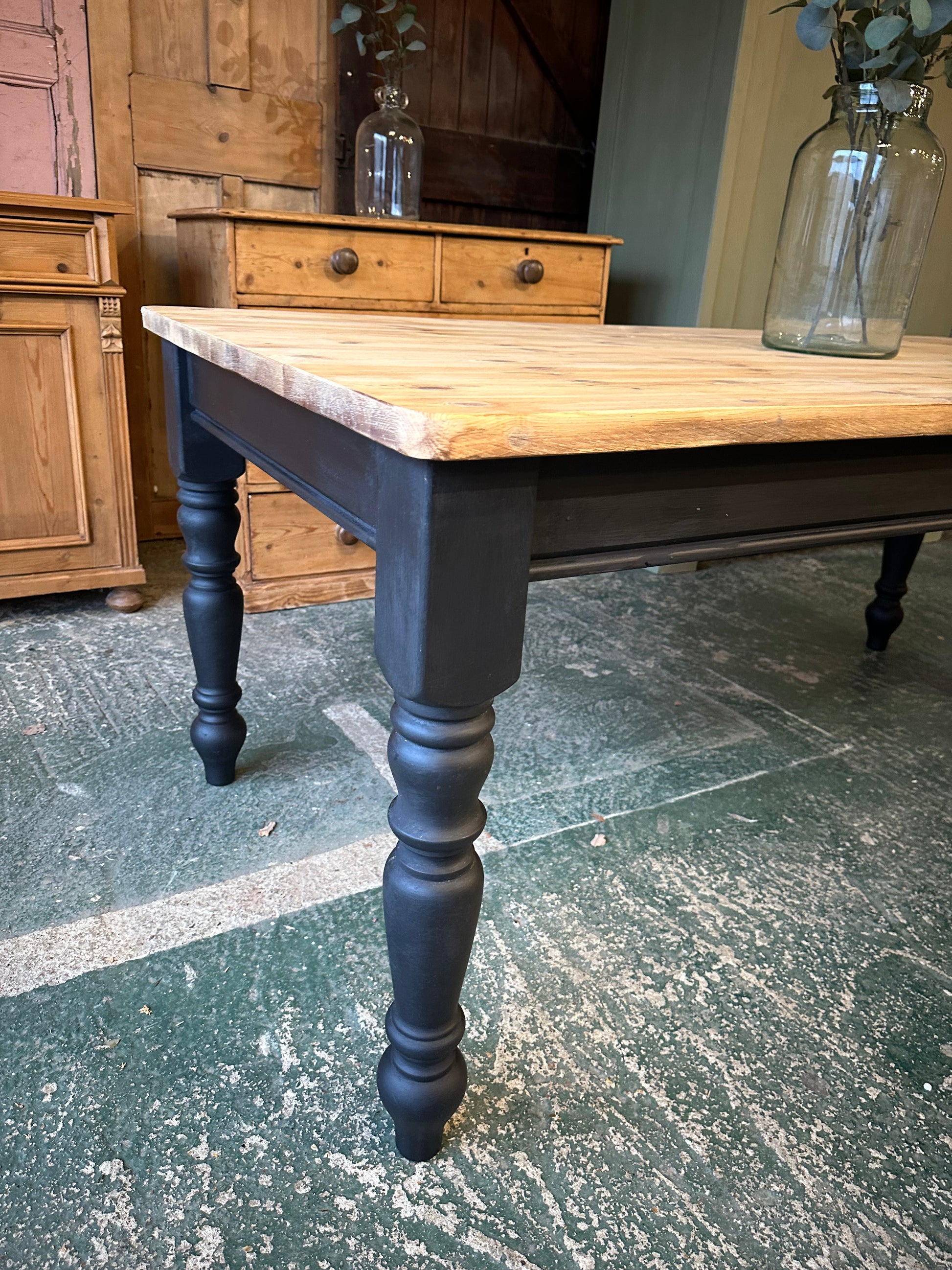 Beautiful rustic farmhouse table with gorgeous distressed top and legs painted in a black chalk paint.