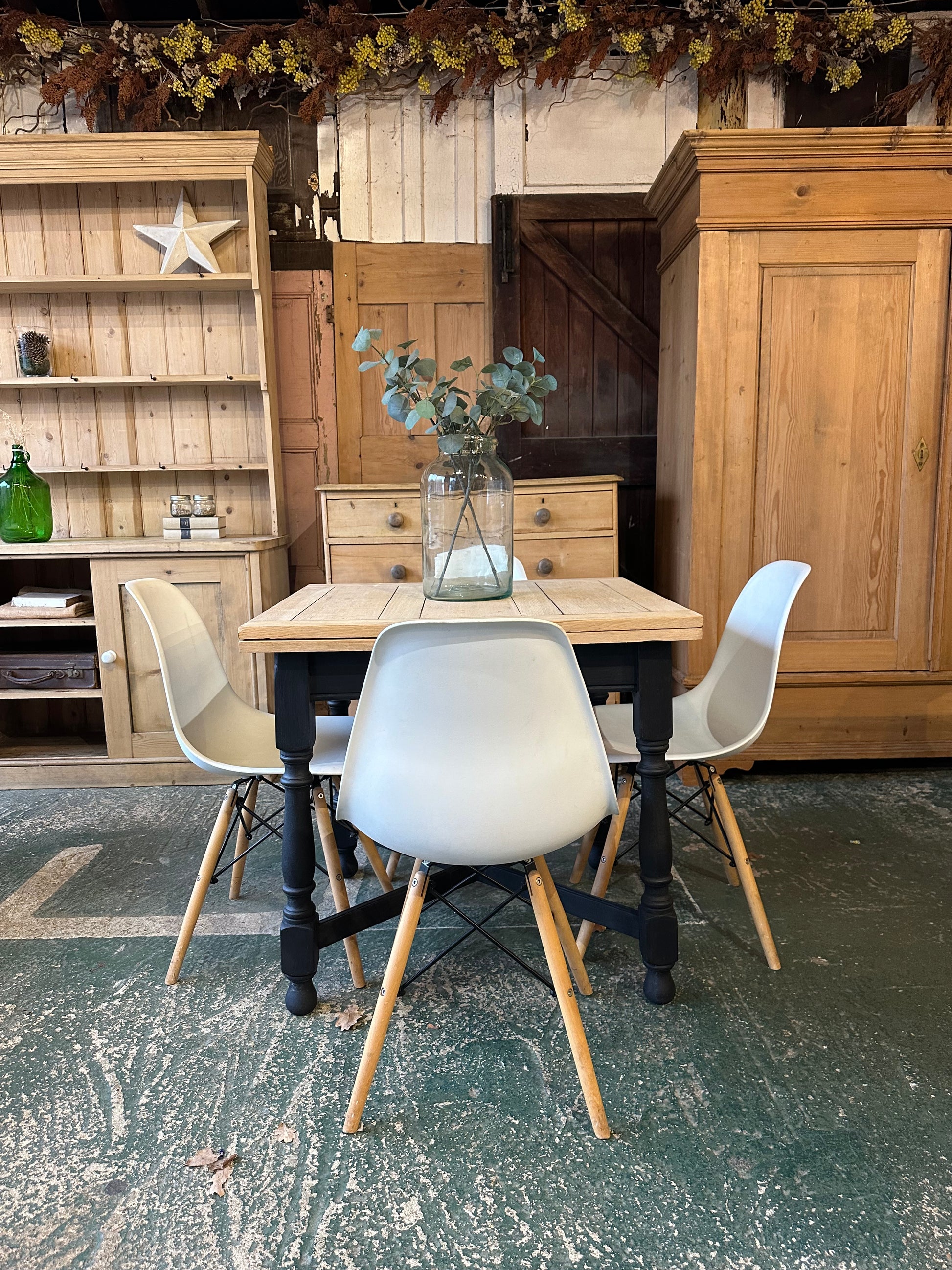 Beautiful rustic oak draw leaf table with gorgeous distressed top and black legs.
