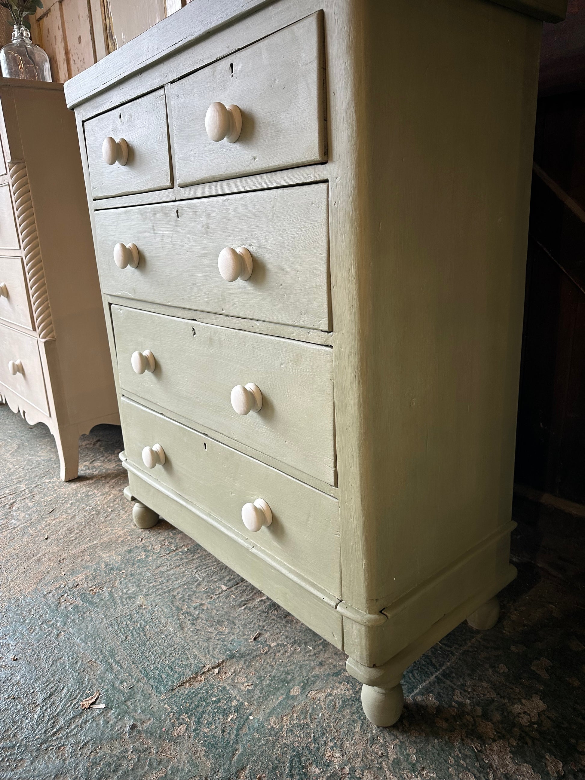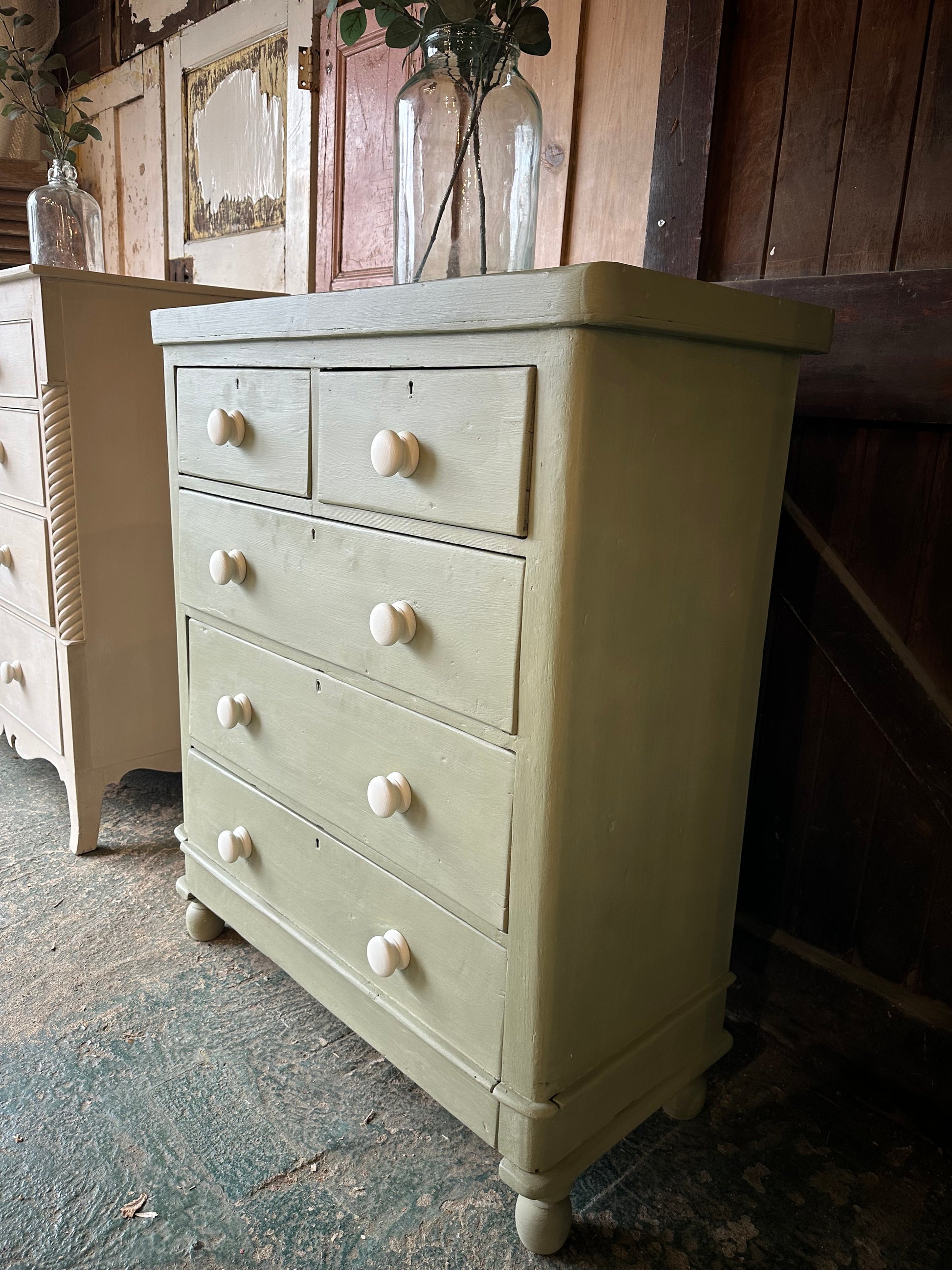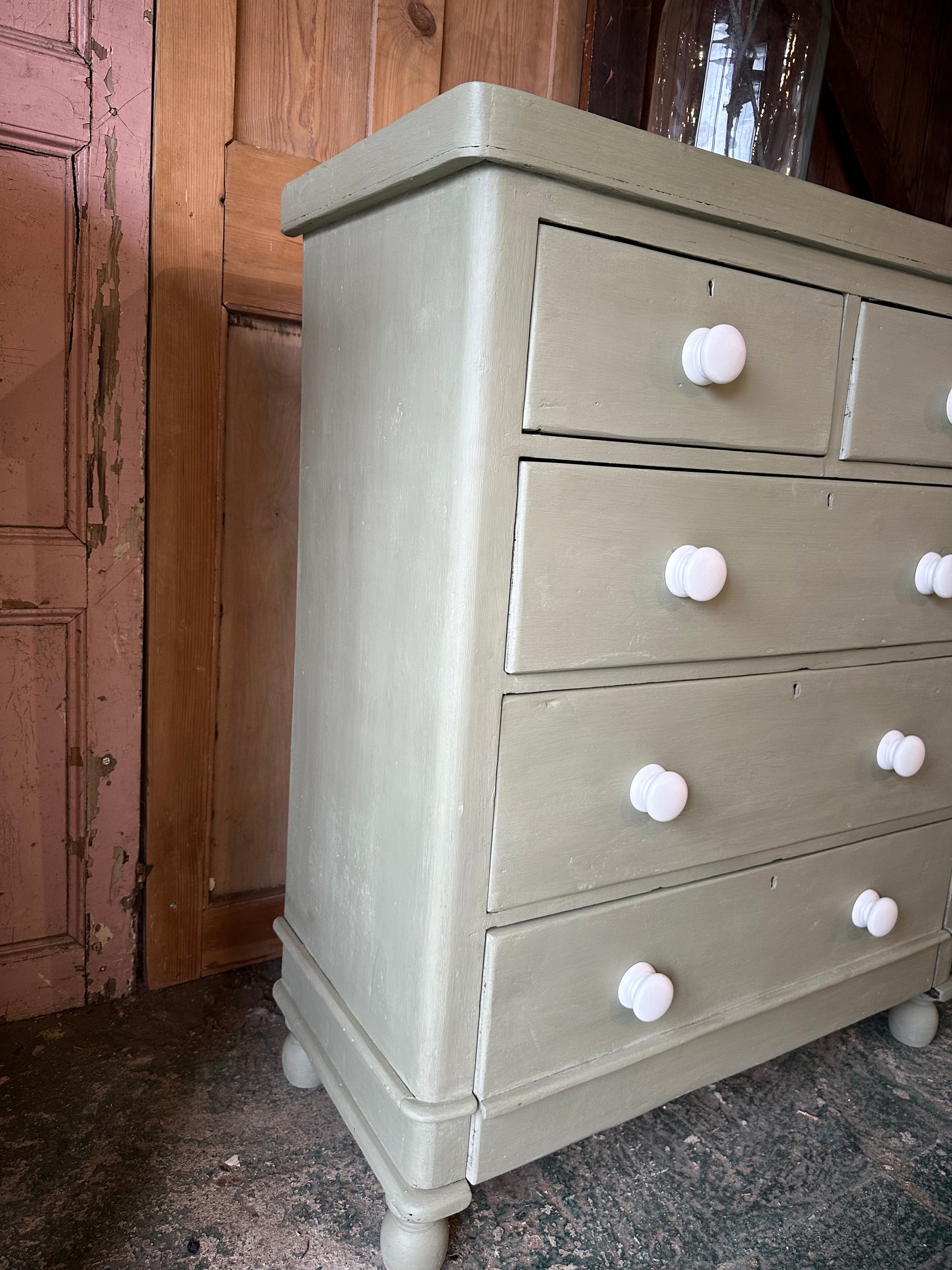 A beautiful vintage chest of drawers that would make a statement in any room. Painted in a soft green with white painted handles.