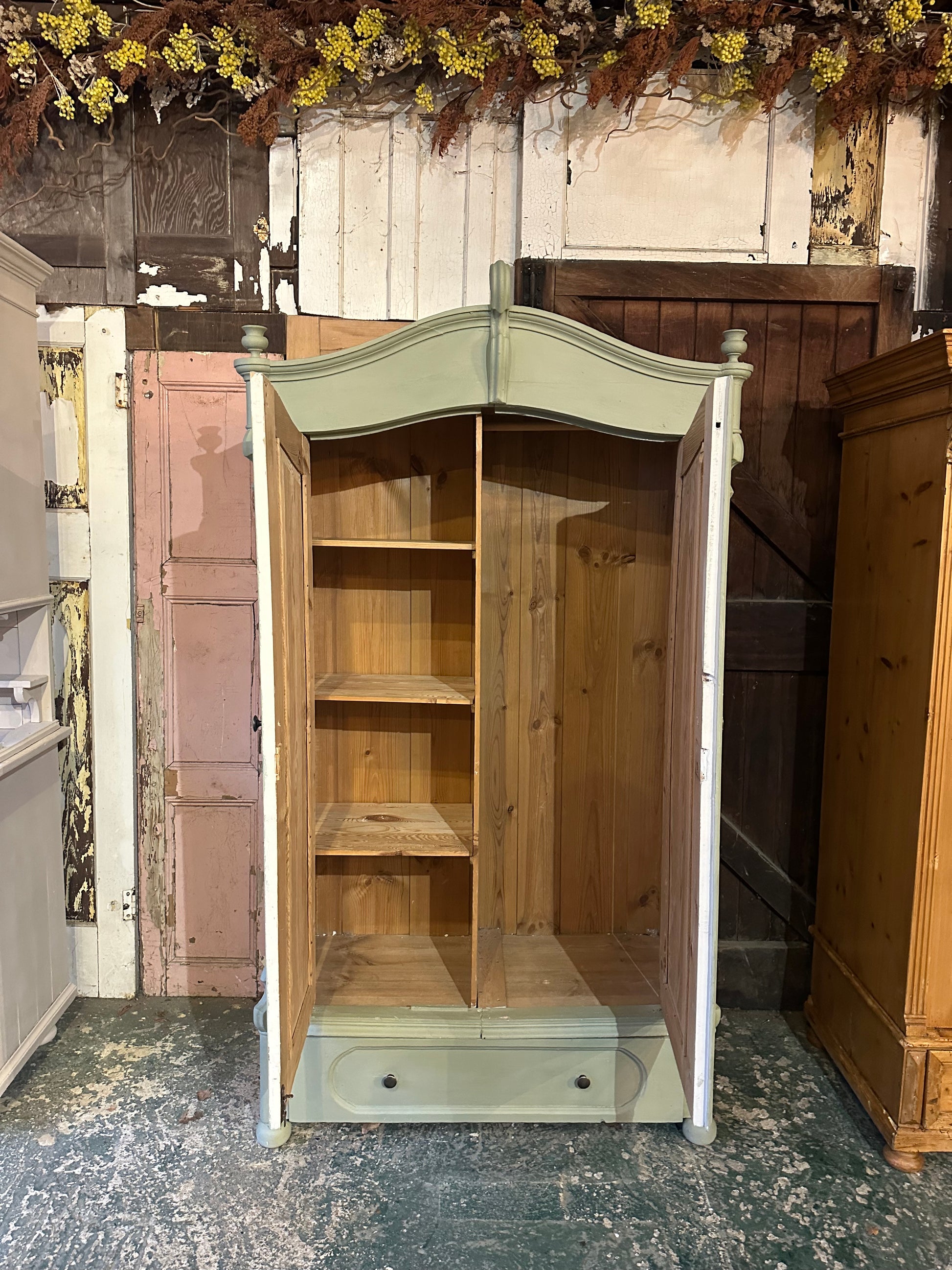 Beautiful Rustic wardrobe. Rail at the top on one side, shelves on the other and drawer at the bottom. Hand painted in a soft green.
