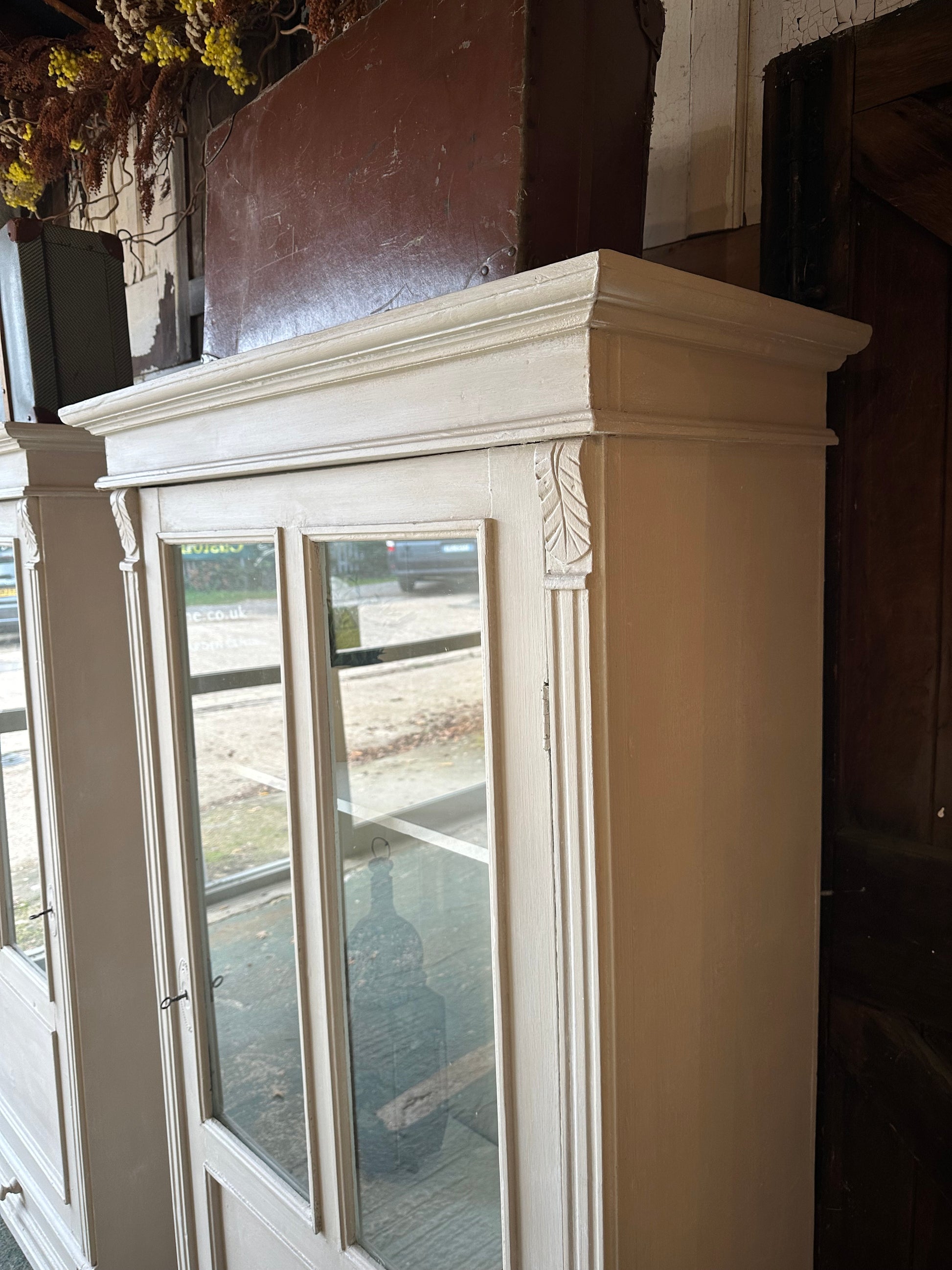 An elegant glazed display cabinet. 1 of a matching pair. Hand painted in a soft grey/beige.