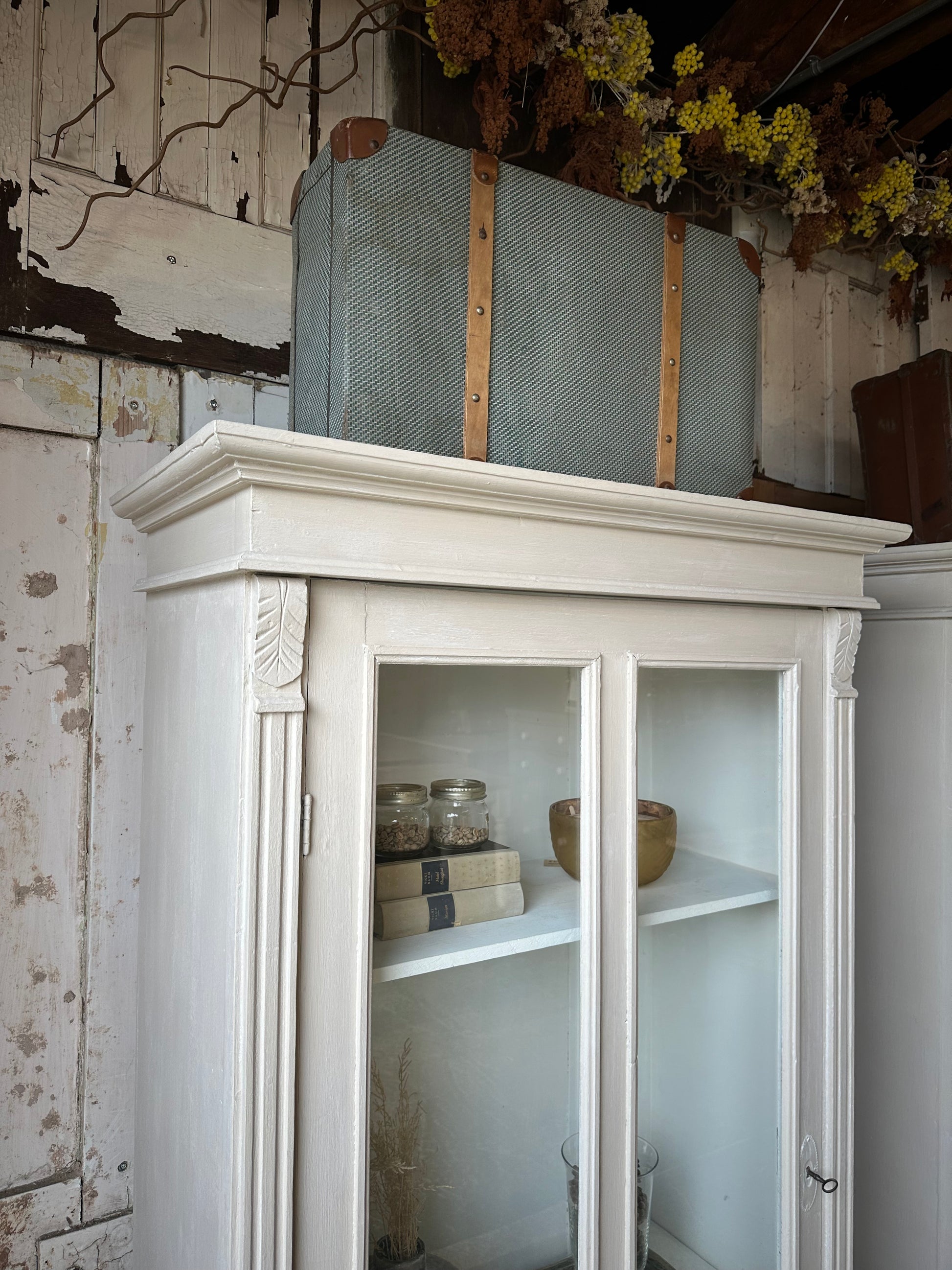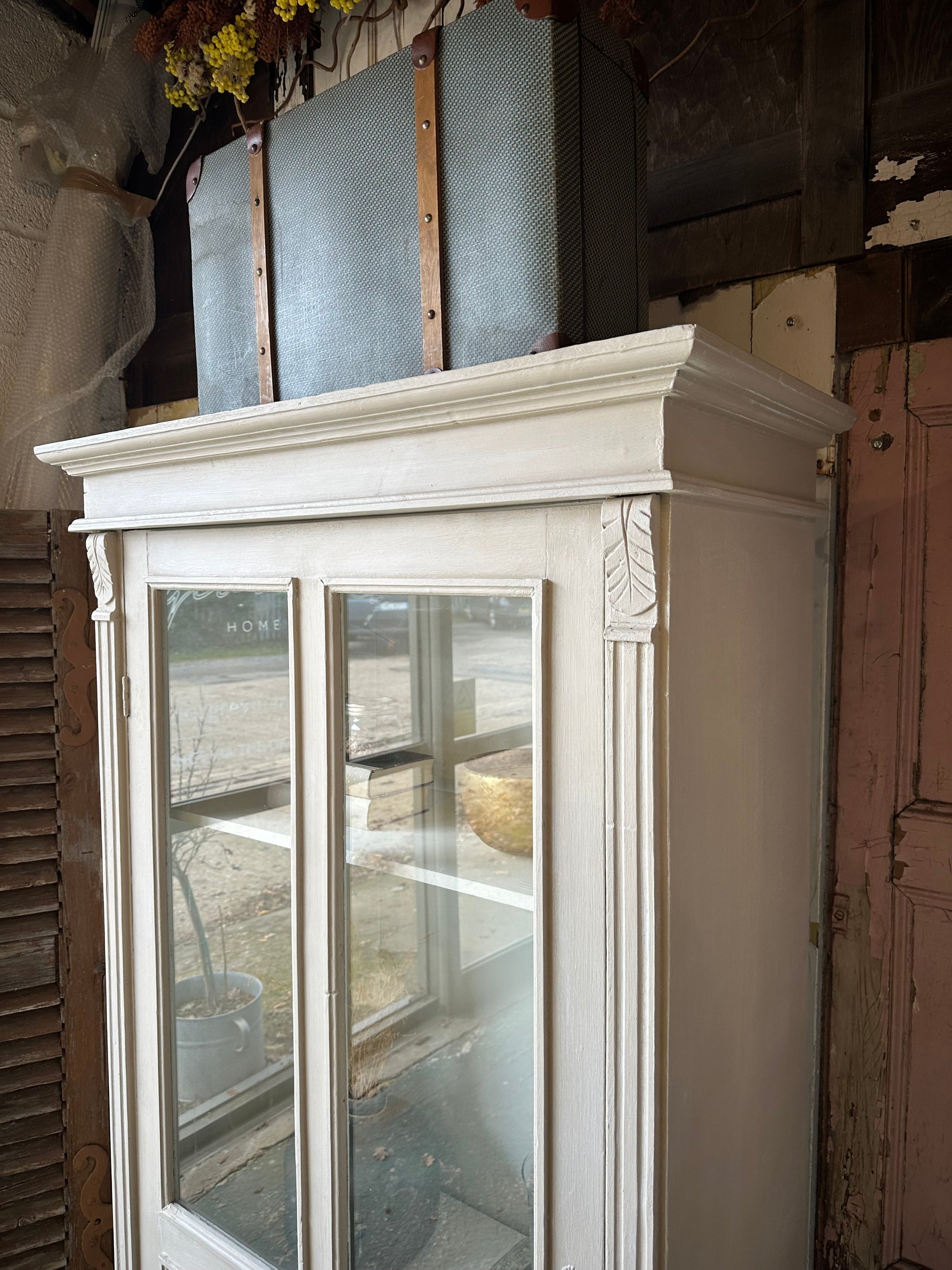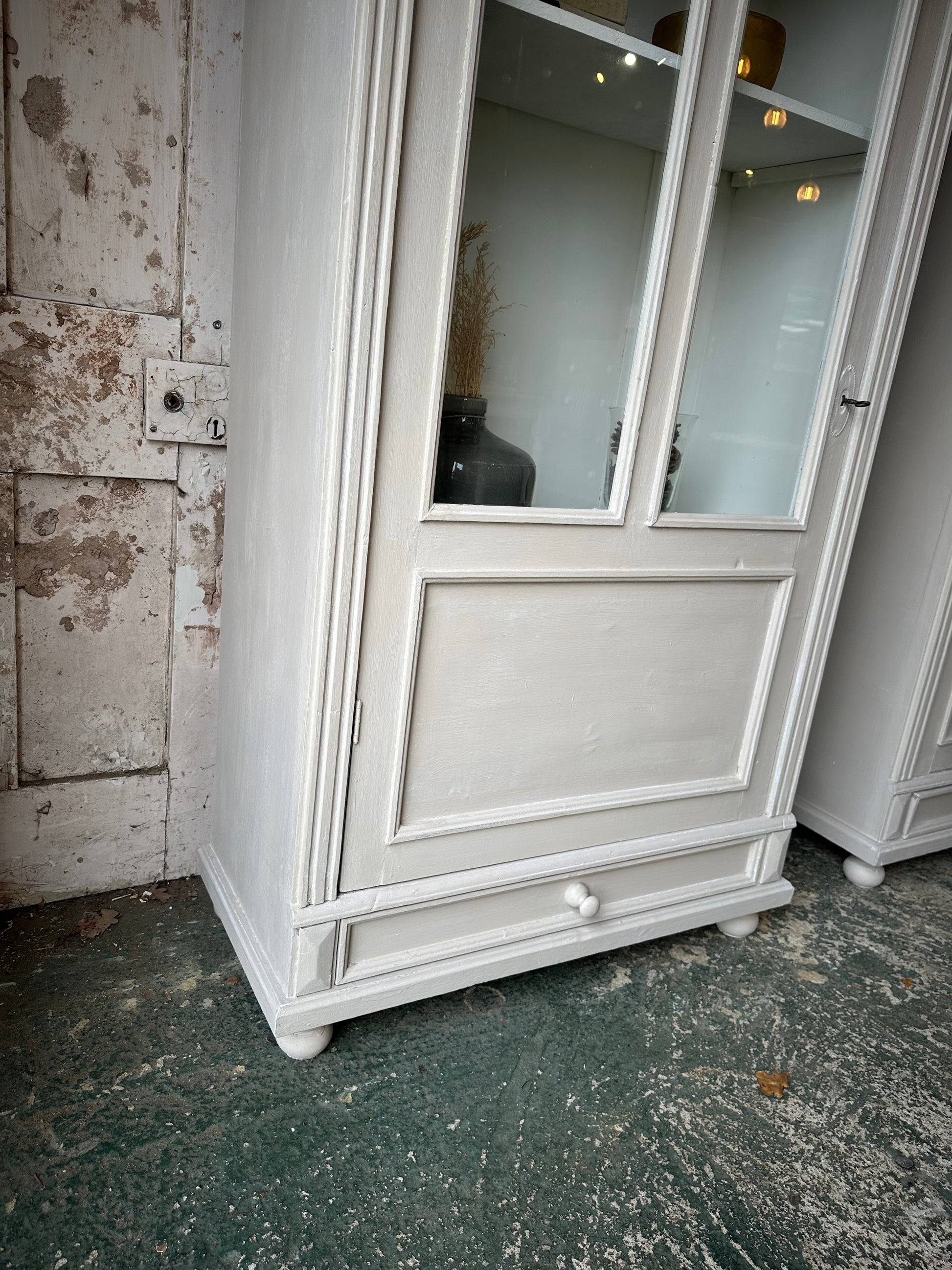 An elegant glazed display cabinet. 1 of a matching pair. Hand painted in a soft grey/beige. A one off used piece with signs of wear and tear. Width 96 Cm Height 175.5 Cm Depth 44.5 Cm Shows signs of wear and tear which add to the character. Collection by appointment (Court Farm Garden Centre) or quote for delivery available on request (please provide postcode). Delivery usually costs between £60-£90. Please take a look at our other listings or follow Taylor Grey Home T2285 |